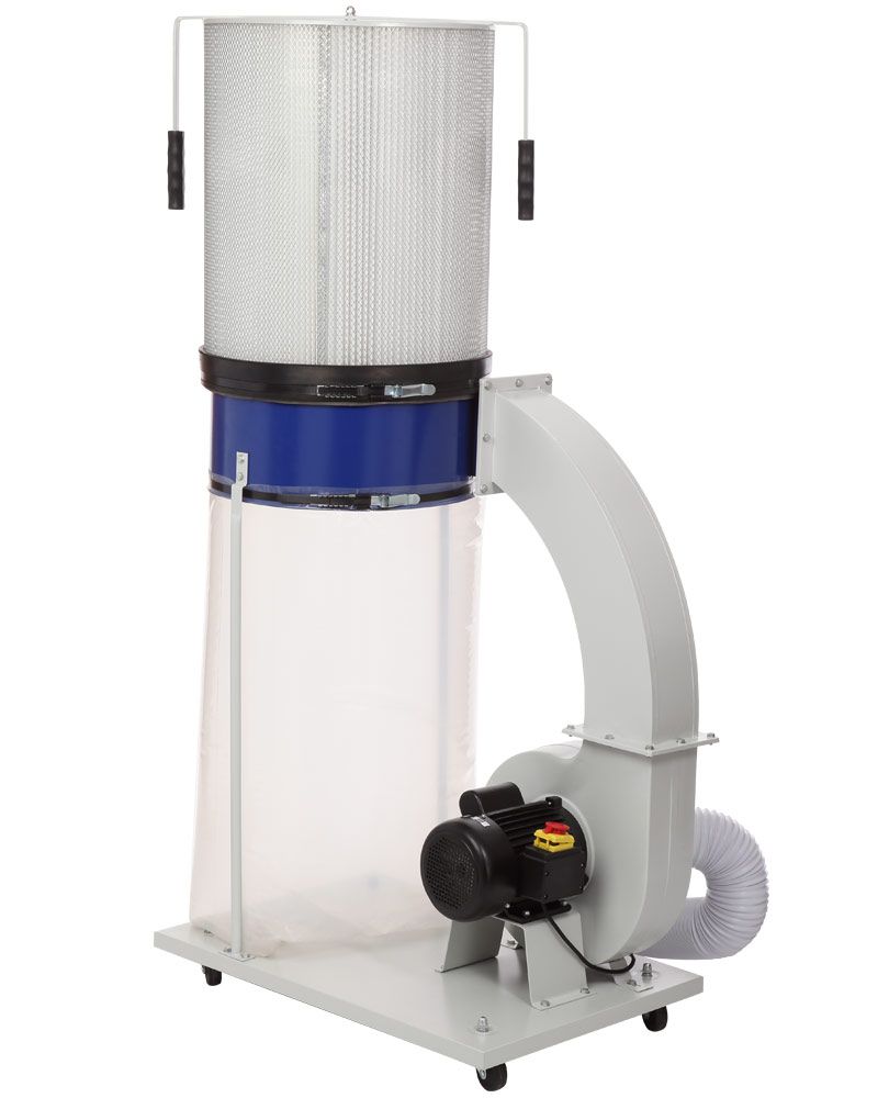Конструкция представляет собой основание, на котором размещены корпус установки с асинхронным двигателем и стойки. Выходной патрубок установки соединен стальным отводом прямоугольного сечения с разделительным корпусом. На входной патрубок вытяжки (Ø125 мм) устанавливается адаптер с двумя входами (Ø100 мм), поэтому вытяжку можно подключить сразу к двум точкам удаления отходов резания. Если задействован только один вход, то второй закрывается крышкой. К стальным стойкам прикреплен разделительный корпус, на верхнюю часть которого установлен фильтр, а снизу закреплен стружкосборник.