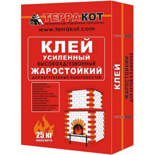 Жаростойкий усиленный клей «Терракот» применяется для облицовки печей, каминов, печей-барбекю, мангальных зон, банных экранов и прочих нагреваемых поверхностей керамической плиткой, природным камнем и облицовочным керамическим кирпичом, а также для монтажа полов с подогревом.